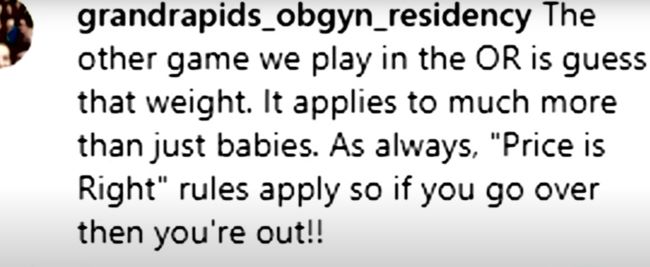 وتم إرفاق إحدى الصور التي تظهر طبيبا يحمل عضوا بشريا غير واضح بسبب الدماء التي غطته بتعليق يقول: "هذه اللعبة الجديدة في غرفة العمليات.. هل يمكنك تخمين وزن هذا العضو؟".