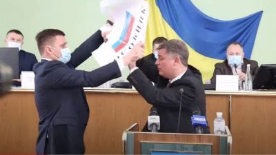 اشتعل شجار تخلله عراك بين نائبين خلال اجتماع المجلس الإقليمي بمقاطعة خيرسون جنوبي أوكرانيا أمس الجمعة بسبب يافطة عليها صورة لعلم روسيا.