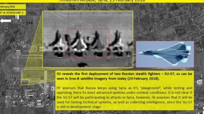 ونقلت صحيفة هآرتس الإسرائيلية عن مصادر أمنية قولها إن قمرا صناعيا إسرائيليا التقط صورا لمقاتلات "سو-57" الروسية من الجيل الخامس وهي في مدرجات قاعدة حميميم جنوب شرقي مدينة اللاذقية السورية.