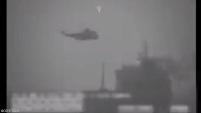 وبثت القيادة المركزية بالجيش الأميركي تسجيل فيديو مشوشا بالأبيض والأسود تظهر فيه طائرة هليكوبتر قرب سفينة ضخمة.