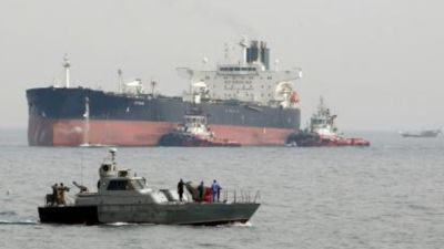 زورق دورية إيران في مياه الخليج على مقربة من ناقلة نفط تستعد للرسو في ميناء جزيرة خرج النفطي