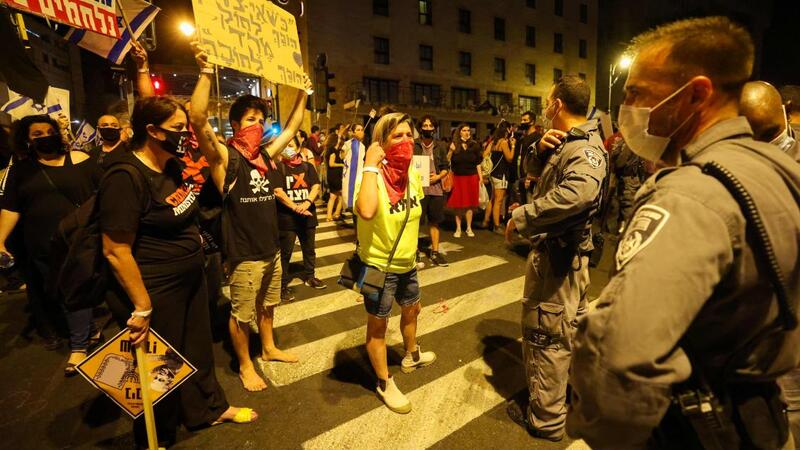 ويتجمع آلاف المحتجين أسبوعيا أمام مقر الإقامة الرسمي لنتنياهو في القدس للمطالبة باستقالته بسبب طريقة إدارته للأزمة الصحية ومزاعم الفساد وقد جاء كثيرون منهم من مدن أخرى.