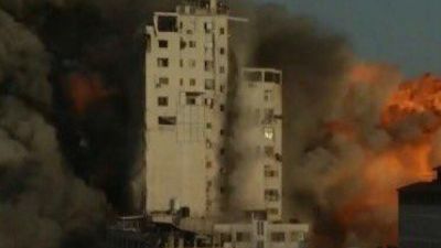 قصف الجيش الاسرائيلي الاربعاء، برج الشروق السكني في وسط مدينة غزة، ما ادى الى انهياره، فيما ردت المقاومة بإطلاق عشرات الصواريخ صوب مناطق متفرقة داخل إسرائيل بما فيها مدينة تل أبيب،