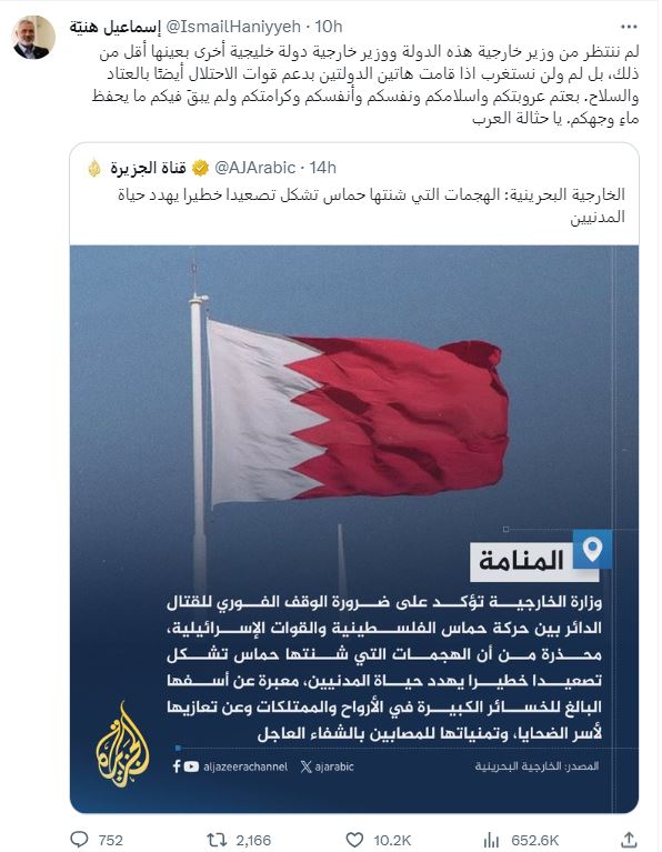 في المحصلة رد الصفحة المزعومه التي تحمل اسم اسماعيل هنية كان قاسيا حيث قالت التغريده المرفقة مع صورة لعلم البحرين وتصريح  مكتوب لوزارة الخارجية
