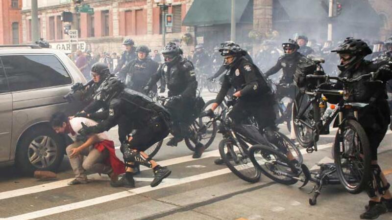 وقالت صحيفة سياتل تايمز إن الشرطة استخدمت”كرات متفجرة” لتفريق الحشد الذي كان يلقى الحجارة والزجاجات وقام بتحطيم نوافذ في حي بوسط المدينة.