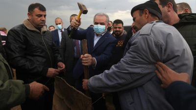 اشتية يساعد السكان في إعادة بناء حظيرة للأغنام في الموقع الواقع في شمال شرق الضفة الغربية
