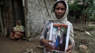 مسلمة من الروهينغا تحمل صورة ابنها الذي طُعن واختطف من منزله في 4 تموز/يوليو 2017 في قرية مونغ هناما في ولاية راخين حيث يقول المسلمون أنهم يعيشون في خوف دائم