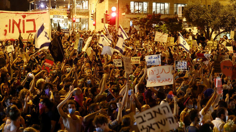 ويطالب المشاركون في الاحتجاجات المستمرة منذ عدة أسابيع باستقالة نتنياهو على خلفية ما يصفونه بفشل حكومته في التعامل مع جائحة فيروس كورونا وتداعياتها الاقتصادية وكذلك قضايا الفساد التي يتم في إطارها التحقيق مع رئيس الوزراء.
