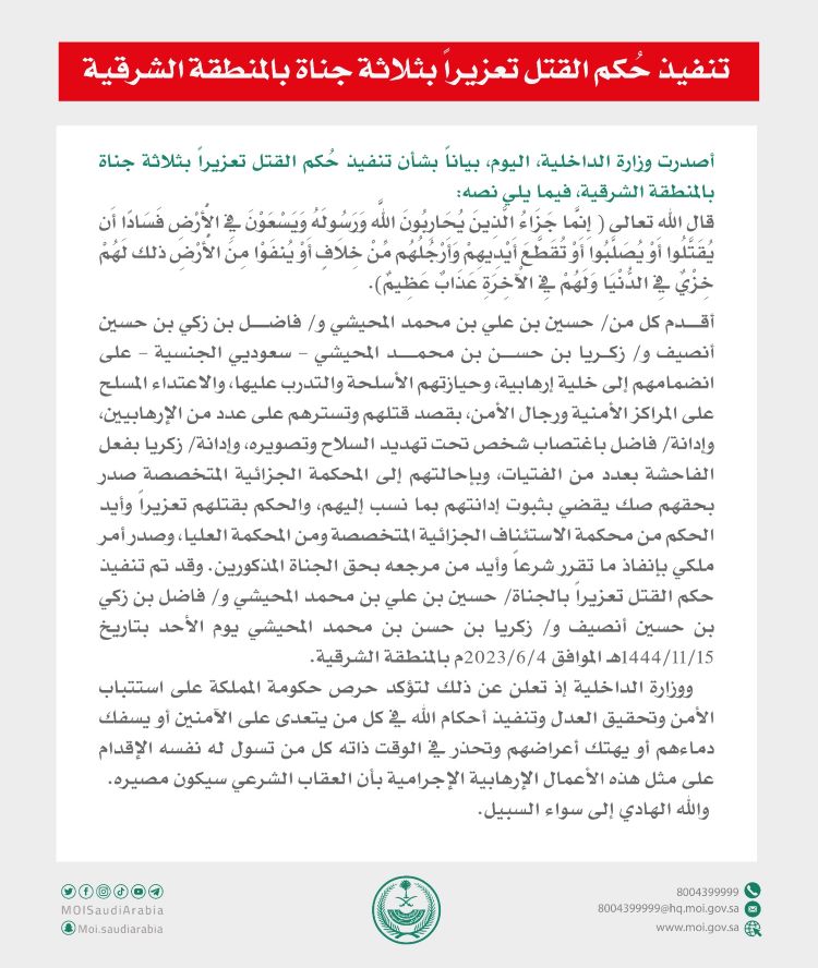 بيان وزارة الداخلية السعودية حول اعدام الرجال الثلاثة