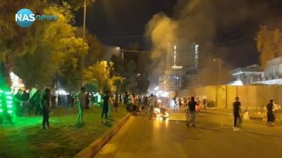 ومساء الأحد، أضرم مئات المتظاهرين الغاضبين النار في إطارات السيارات الفارغة أمام مبنى القنصلية، احتجاجاً على اغتيال الناشط في الحراك الشعبي إيهاب الوزني، متهمين الفصائل العراقية المرتبطة بإيران بالوقوف وراء تصفيته.