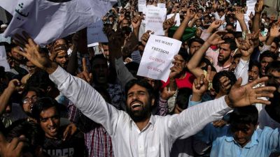 وحمل المتظاهرون لافتات عليها عبارات من قبيل: "أوقفوا قتل الكشميريين"، و"فليخرج الجيش الهندي من كشمير"، و"كشمير ليست هندية".