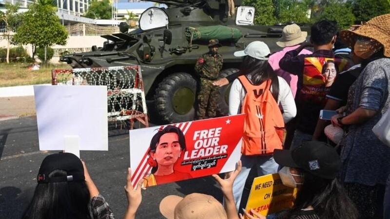 ورغم انتشار العربات المصفحة والجنود في بعض المدن الكبرى في مطلع الأسبوع، تظاهر المحتجون مرة أخرى يوم الاثنين للتنديد بانقلاب الأول من فبراير/ شباط والمطالبة بالإفراج عن الزعيمة المحتجزة أونغ سان سو تشي وآخرين.