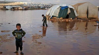 وتفيد تقارير بأن هطول الأمطار الغزيرة عبر غرب حلب وإدلب شمال غربي سوريا تسبب في أضرار لحقت بمواقع النازحين داخليا. وقد تضررت خيام وتم قطع الطرق المؤدية إلى المخيمات.