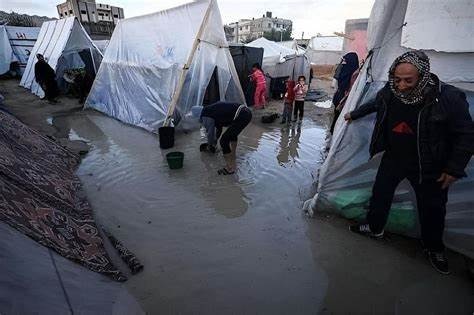 من جهة أخرى تعرضت الخيام التي تؤوي آلاف النازحين في مناطق عديدة من القطاع صباح اليوم الأحد، إلى أضرار جسيمة بعد أن تدفقت مياه الأمطار بداخلها، ما أدى إلى تضرر وإتلاف أمتعتهم وأفرشتهم.