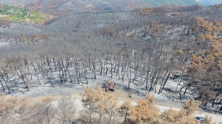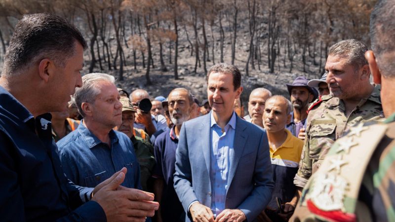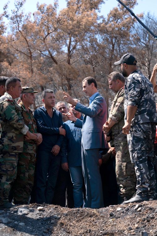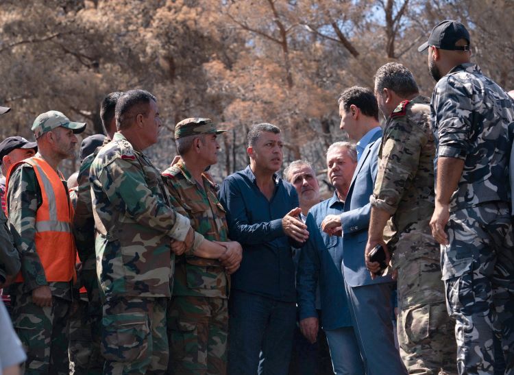 ونشرت الرئاسة السورية عبر حساباتها في مواقع التواصل صورا للاسد وهو يتحدث مع حشد من عناصر فرق الاطفاء الامن والجيش وسط منطقة غابات احرقتها النيران بالكامل.