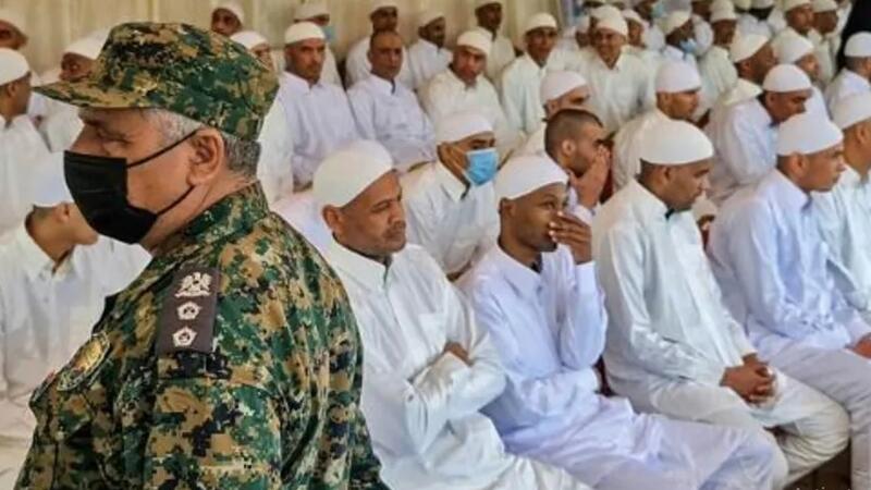 وظهر العشرات من العناصر المفرج عنهم بلباس أبيض داخل ملعب صغير لكرة القدم ملاصق لأحد المقرات الأمنية في مدينة الزاوية الساحليّة، وكانوا محاطين برجال أمن مسلحين.