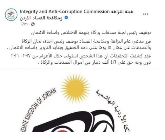 وكانت تقارير رسمية مصدرها هيئة النزاهة ومكافحة الفساد الاردنية اشارت الى انها رئيس لجنة زكاة وصدقات في العاصمة عمان 15 يوما على ذمة التحقيق بعد اتهامه باختلاس 416 الف دينار (حوالي 586 الف دولار) من اموال الصدقات والزكاة، وفق بيان للهيئة تم تداوله يوم الاثنين الماضي