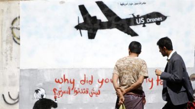 رجال ينظرون الى جدارية في صنعاء لطائرة اميركية بدون طيار