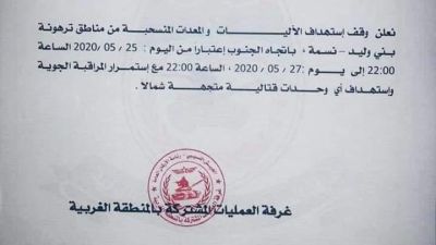 وقال الجيش: “نعلن وقف استهداف الآليات والمعدات المنسحبة من مناطق ترهونة وبني وليد (جنوب طرابلس) ونسمة (الجنوب الغربي من العاصمة) والمتجهة باتجاه الجنوب”.