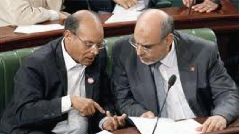 ارشيف/ الرئيس التونسي المنصف المرزوقي (يسار) يتحدث الى رئيس الوزراء المستقيل حمادي الجبالي