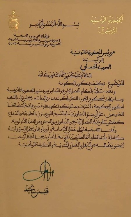 وبخط مغربيّ، كتب سعيد في الرسالة: “عملا بأحكام الفصل التاسع والثمانين من دستور الجُمهورية التونسية وبناء على ترشيحكم من قبل الحزب الفائز بأكبر عدد من المقاعد بمجلس نواب الشعب لتكوين الحكومة، أتشرف بدعوتكم لتكوينها ومديّ بقائمة أعضائها المقترحين، على أن يتم التشاور بيننا بالنسبة إلى وزيري الخارجية والدفاع”.