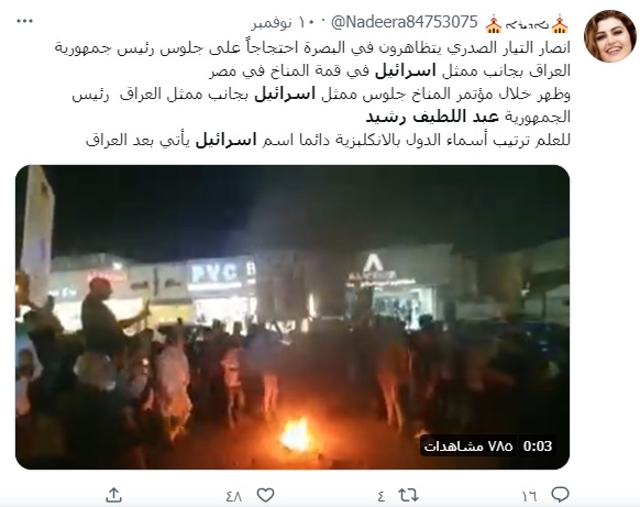وخلال مؤتمر المناخ "كوب 27" في شرم الشيخ المصرية، جلس الرئيس العراقي بجوار الوفد الاسرائيلي الذي ضم وزيرة البيئة تامار زاندبرغ، وسفيرة تل أبيب لدى مصر أميرة أورون.
