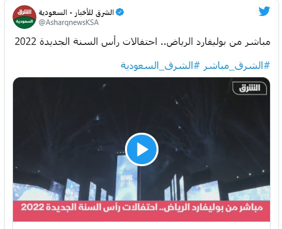 وبثت فضائية "الشرق" السعودية عبر حسابها في "توتير"، مباشرة مظاهر احتفالات رأس السنة الجديدة 2022، والتي تخللها إطلاق ألعاب نارية بكثافة وسط أجواء ترفيهية.ويعد