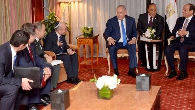 ساد اللقاء الذي جمع الرئيس المصري عبد الفتاح السيسي برئيس الوزراء الإسرائيلي بنيامين نتنياهو في نيويورك أجواء من الضحك وتبادل النكات لكن الصحف الإسرائيلية ركزت على استلطاف السيسي لأحد المستشارين الأمنيين.