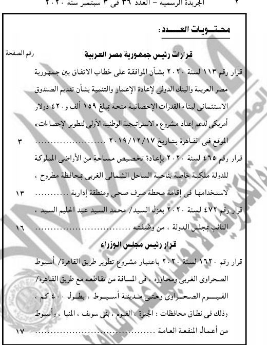 ويحمل القرار الجمهوري الأول رقم 113 لسنة 2020، بشأن الموافقة على خطاب الاتفاق بين مصر والبنك الدولي لإعادة الإعمار والتنمية، حول تقديم الصندوق الاستئماني لبناء القدرات الإحصائية، منحة بمبلغ 159 ألفا و420 دولارا أمريكيا لدعم إعداد مشروع الاستراتيجية الوطنية الأولى، لتطوير الإحصاءات الموقع في القاهرة بتاريخ 17 ديسمبر 2019.