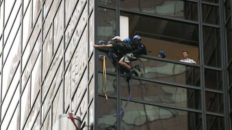 تسلق رجل برج ترامب بوسط حي مانهاتن عصر الأربعاء لأكثر من ساعتين باستخدام ما بدا أنها أكواب تشفط الهواء وحبال للتسلق لكن الشرطة تمكنت من سحبه إلى داخل المبنى من خلال إحدى النوافذ بعد أن بذلت معه محاولات ودية لإقناعه بإنهاء مغامرته.