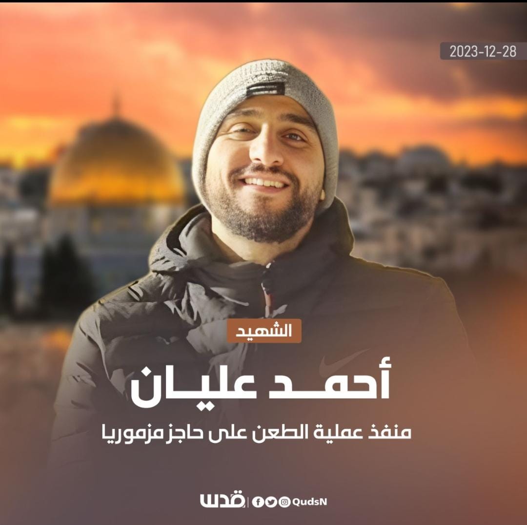 نفذ الشهيد أحمد عليان، ليلة الخميس، عملية طعن عند حاجز " مزموريا" بين القدس وبيت لحم ، وأسفرت العملية عن إصابة اثنين من جنود الاحتلال أحدهم بجراح خطيرة .