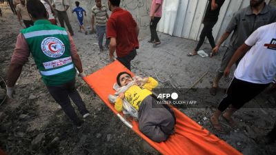 مسعفون يحملون شابا من ذوي الاحتياجات الخاصة بعد غارة إسرائيلية على مخيم المغازي في وسط غزة. 6 تشرين الثاني، 2023. تصوير: ياسر قديح. وكالة الصحافة الفرنسية