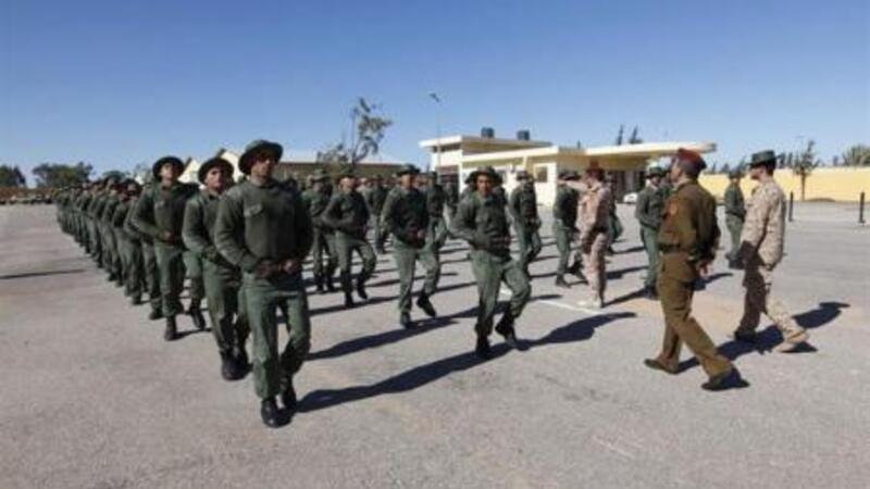 فوق أرض متربة خارج العاصمة الليبية طرابلس يسير مجندون شبان يرددون شعارات للجيش الليبي الجديد الذي تأمل القوى الغربية في أن يتمكن من كبح جماح المسلحين الذين يهددون باغراق البلاد في خضم الفوضى.