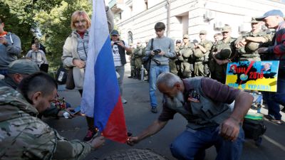 وفي كييف داس متظاهرون علما روسيا فيما حمل اخرون دمية تمثل فلاديمير بوتين على حبل مشنقة بلباس سجين. ووقعت مواجهات مع روس قدموا للتصويت ما دفع الشرطة الى التدخل وتوقيف ثلاثة متظاهرين، كما اعلنت اوكسانا بليشيك متحدثة باسم قوات الامن لوكالة فرانس برس.