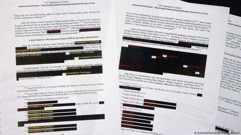 وكان المدعي العام مولر، أكد في تقريره في ختام 22 شهرا من التحقيقات، وجود “صلات عديدة” بين روسيا وأعضاء في حملة دونالد ترامب لكنه اعتبر أنه ليس هناك أدلة على أي تواطؤ.