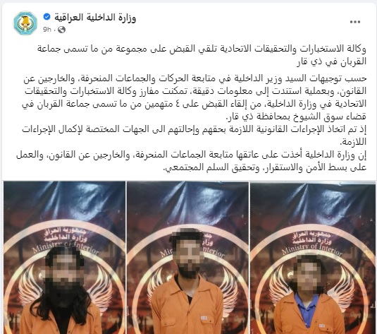 وقالت وزارة الداخلية العراقية في بيان عبر صفحتها الرسمية في فيسبوك الجمعة، ان وكالة الاستخبارات والتحقيقات الاتحادية التابعة لها تمكنت من القبض على اربعة من اعضاء جماعة القربان في قضاء سوق الشيوخ بمحافظة ذي قار جنوبي البلاد.