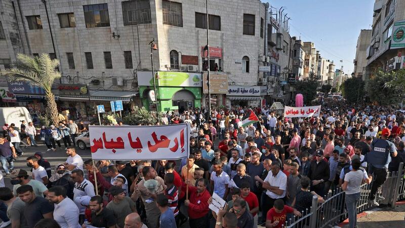 تظاهر مئات الفلسطينيين، اليوم السبت، وسط مدينة رام الله مطالبين برحيل الرئيس الفلسطيني محمود عباس بعد وفاة ناشط سياسي منتقد لعباس خلال عملية اعتقاله الأسبوع الماضي.