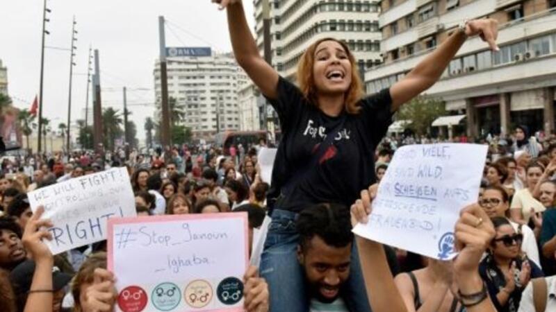متظاهرون في الدار البيضاء بالمغرب في 23 آب/أغسطس 2017 احتجاجا على التعدي الجنسي الجماعي على امرأة في حافلة
