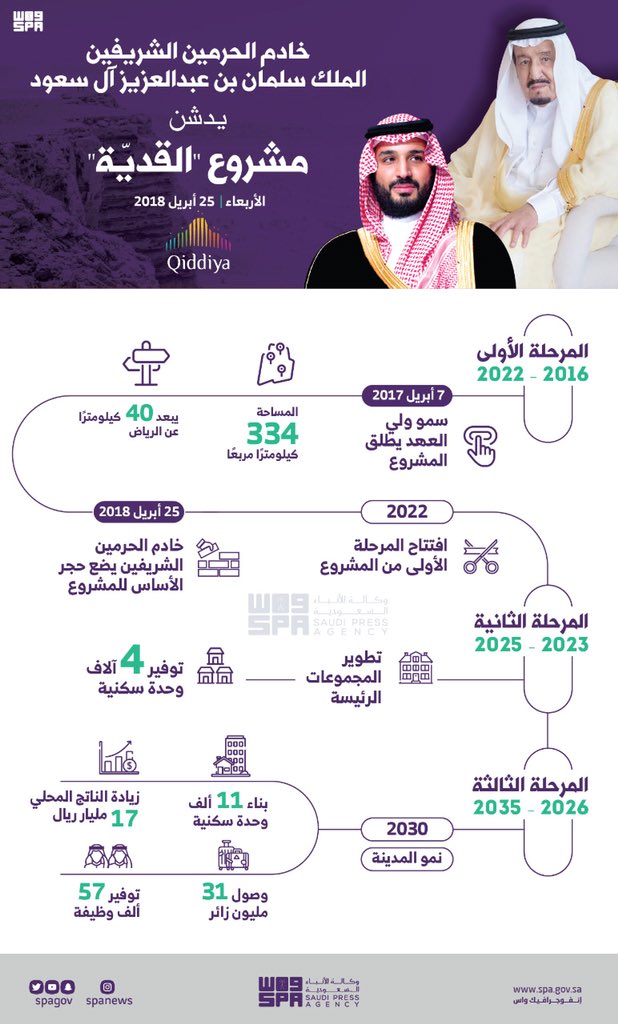 يدشن الملك السعودي سلمان بـن عـبد العزيز غـدا الأربعاء مشروع "القدية"، الوجهة الترفيهية والرياضية والثقافية الجديدة في المملكة، والتي سيتم إنشاؤها غرب الرياض.