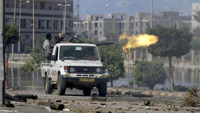 ورد الموالون للقذافي في باديء الامر على النيران بشكل محدود للغاية. لكن مقاتلي القوات الحكومية وقعوا في كمين. وعندما تعرض مقاتلو المجلس الوطني الانتقالي للقذائف الصاروخية ونيران الاسلحة الصغيرة تراجعوا سريعا للاحتماء من القصف بينما كان أحدهم يداوي جرحا في يده.