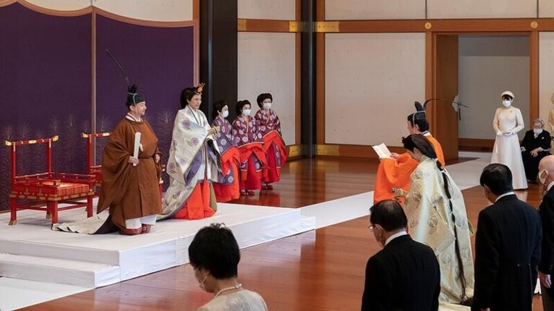 وهذه الاحتفالات التي استمرت طوال اليوم في القصر، كان من المقرر أن تقام في أبريل لكنها أجلت بسبب جائحة فيروس كورونا وتم تقليصها مع استمرار انتشار العدوى، على الرغم من أن اليابان أفلتت من تفشي المرض بشكل كبير كما شوهد في كثير من الدول الأخرى.