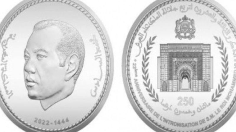 وكان بنك المغرب اعلن عن الاصدار النقدي وقال أن وجه القطعة النقدية يحمل صورة الملك محمد السادس وعبارتي “محمد السادس” و”المملكة المغربية”، مع الإشارة في الأسفل إلى تاريخ 1442 -2021. وكُتبت على ظهر القطعة النقدية التذكارية في الأعلى عبارة” الذكرى الثانية والعشرون لتربع جلالة الملك على العرش”، مع ترجمتها الفرنسية. وتتكون من مزيج من الفضة ‰925 والنحاس ‰75، وتزن 28.28 غراما بقطر يصل إلى 38.61 ميليمترا؛ فيما سيتم طرحها للبيع بمتحف بنك المغرب وبشبابيك فروعه انطلاقا من 2 غشت 2021.