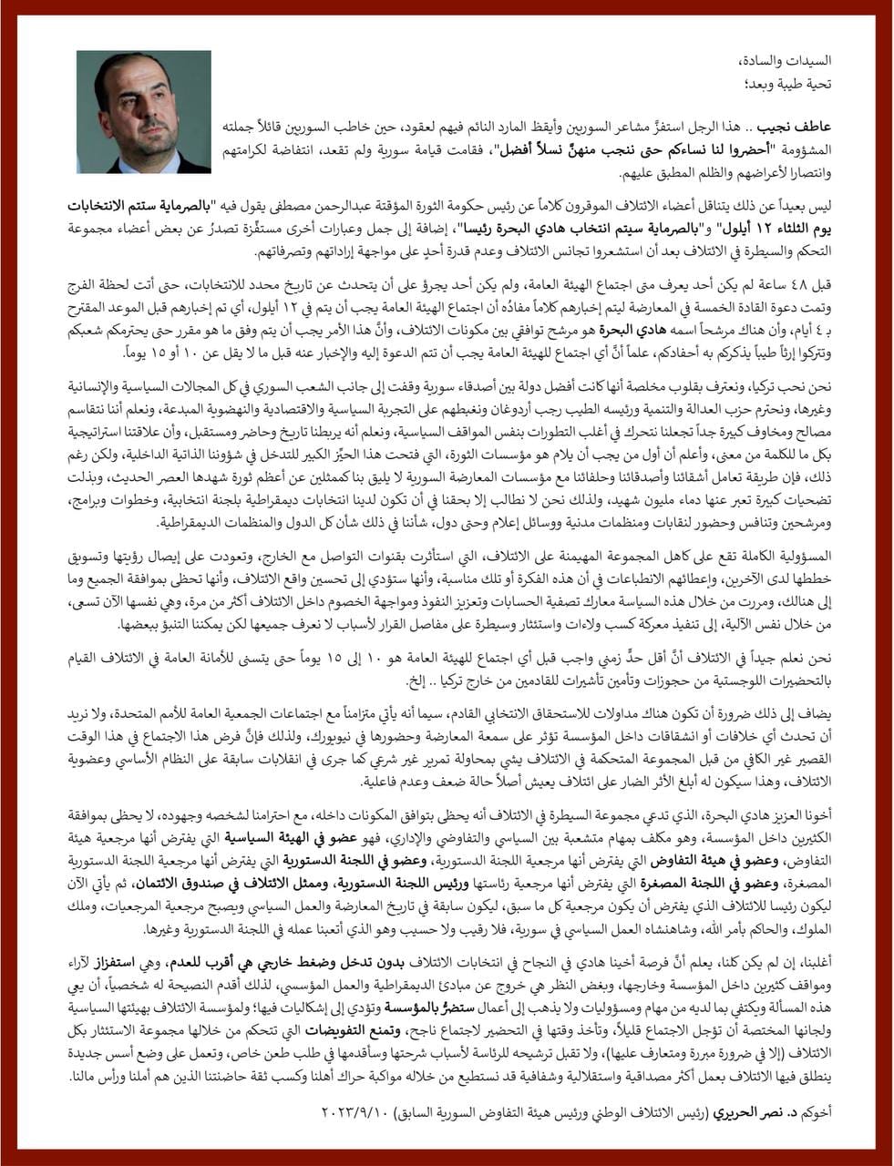 كشفت مصادر في المعارضة السورية عن انتخاب قيادة الائتلاف الوطني بالتوافق على اسم المعارض السوري هادي البحرة رئيسا وهيثم رحمة أمينا عاما للائتلاف