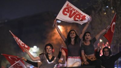 احتفل انصار الرئيس التركي رجب طيب اردوغان بفوزه في الاستفتاء على توسيع صلاحياته على الرغم من خيبة الأمل بعض الشيء من النتيجة المتقاربة جدا بين المعسكرين والبعيدة كل البعد عن الدعم الشعبي الواسع الذي كان يأمل به.