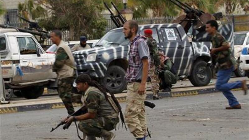 وأثناء قصف الدبابات للعمارات السكنية حيث يتحصن رجال القذافي تقدمت خلفها شاحنات صغيرة مزودة بمدافع الية ثقيلة ثم بدأ المشاة هجومهم مستخدمين بنادق كلاشنيكوف.