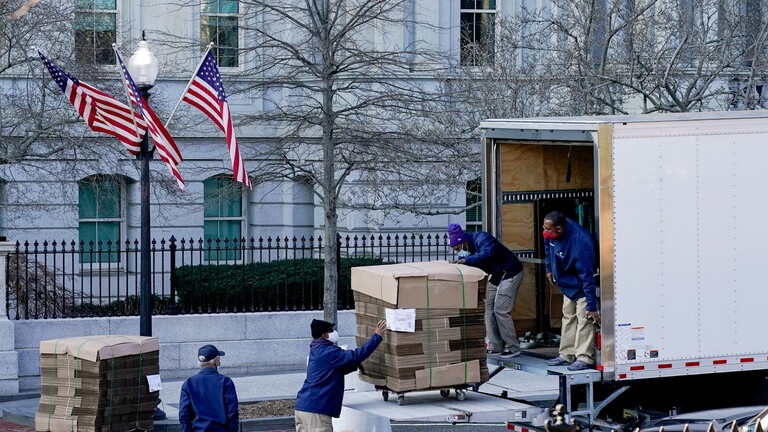 سلمت أكوام من الصناديق الكرتونية الفارغة إلى مبنى المكتب التنفيذي في البيت الأبيض لبدء حزم أمتعة الرئيس المنتهية ولايته دونالد ترامب ومسؤولي إدارته.