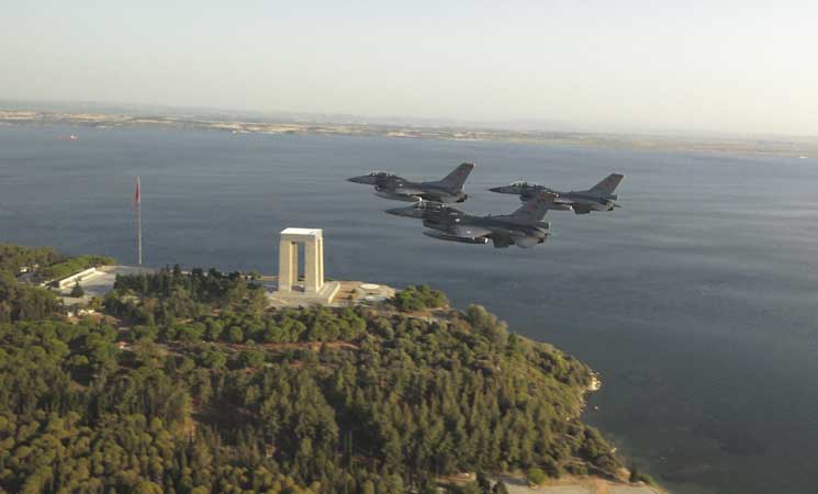 وحلق أكار بطائرة مقاتلة من طراز “إف-16” فوق بحر إيجه، مارا فوق مضيق “جناق قلعة” حيث ألقى التحية على نصب الشهداء.