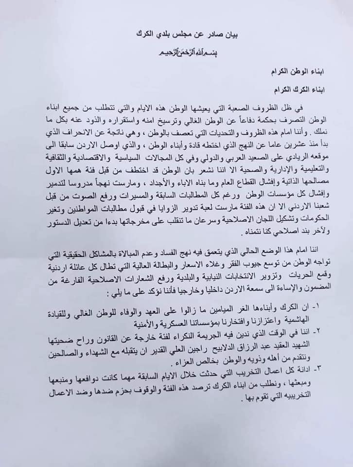 وفيما شدد البيان على ان ابناء الكرك "ما زالوا على العهد والوفاء للوطن وللقيادة الهاشمية واعتزازنا وافتخارنا بمؤسساتنا العسكرية والأمنية ويدين جريمة اغتيال الشهيد العقيد عبد الرزاق الدلابيح التي نفذتها فئة خارجة عن القانون ويدين اعممال التتخريب والتكسير فان يطالب بتغيير نهج الفساد الذي مارسته الحكومات والمتنفذين ومحاسبتهم واسترجاع ما تم نهبه من مقدرات الوطن وأراضي الدولة وذلك اسوة بدول العالم التي تحاسب وتحاكم الفاسدين