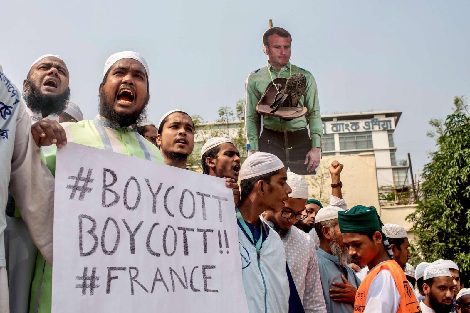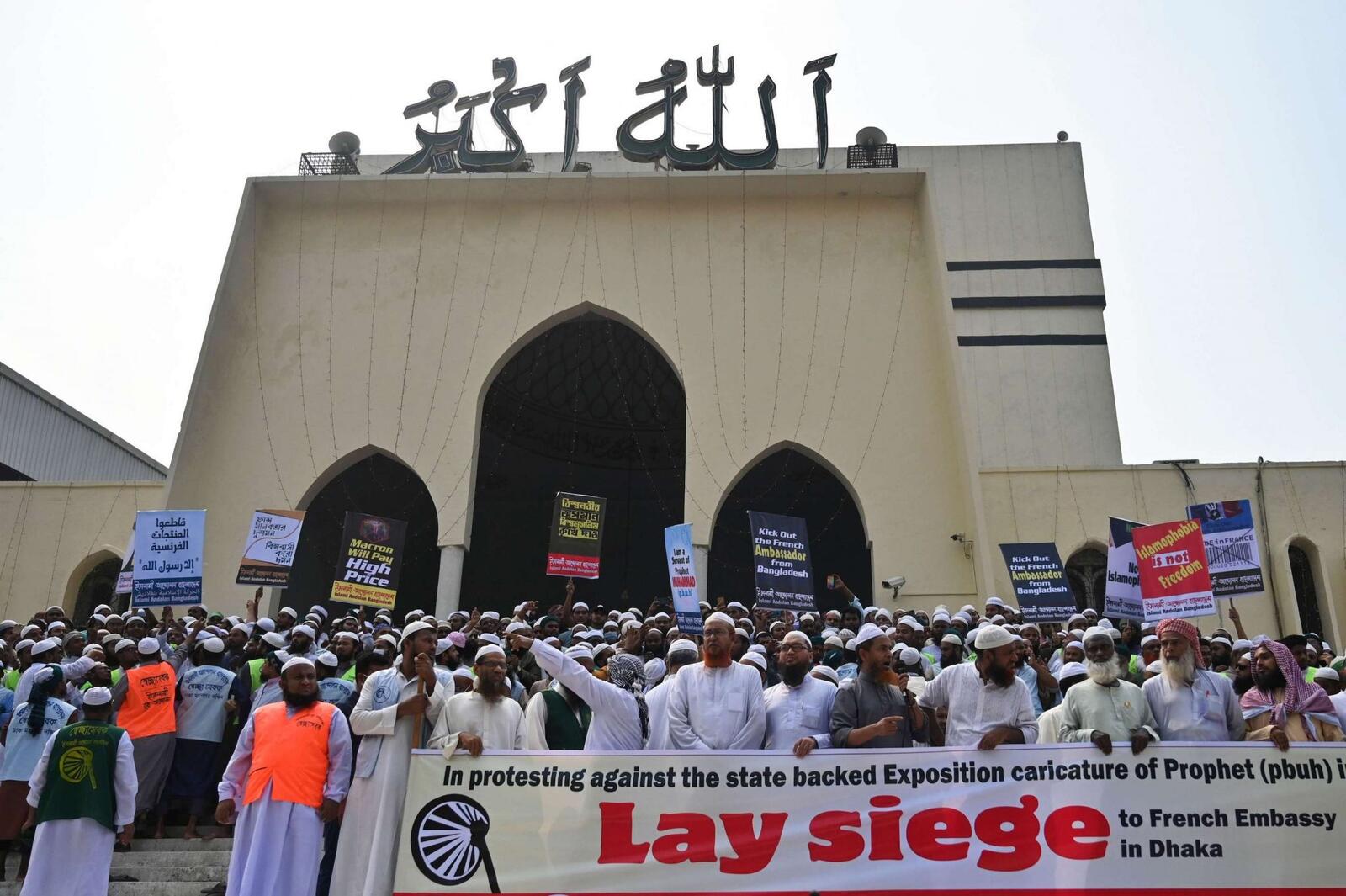 وتظاهر حوالي ثلاثة آلاف شخص أمام مسجد “بيت المكرم” الوطني وسط دكا، وتحركوا في مسيرة باتجاه السفارة الفرنسية.