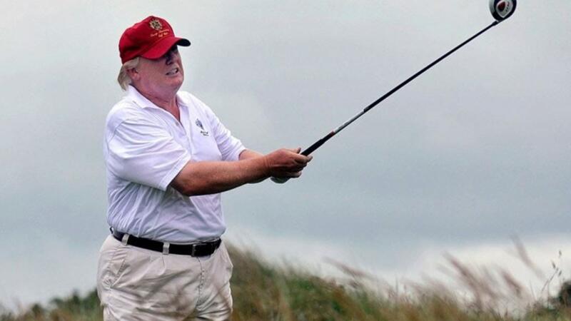 وأظهرت مقاطع بثتها شبكة "سي أن أن" الثلاثاء، الرئيس بالثياب التي يرتديها حين يلعب الغولف، من قميص أبيض وسروال أسود، إلى القبعة الحمراء الشهيرة التي كانت رمزا في حملته الانتخابية، وهو يقود بنفسه سيارة الغولف الصغيرة.